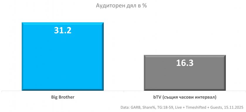 Лидерството на най-стария и прочут риалити формат е стабилно през целия сезон – аудиторният дял на Big Brother 2025 е 29.2%, до момента в който в същия часови период втората телевизия в класацията е с едвам 22.7% в тази възрастова група.