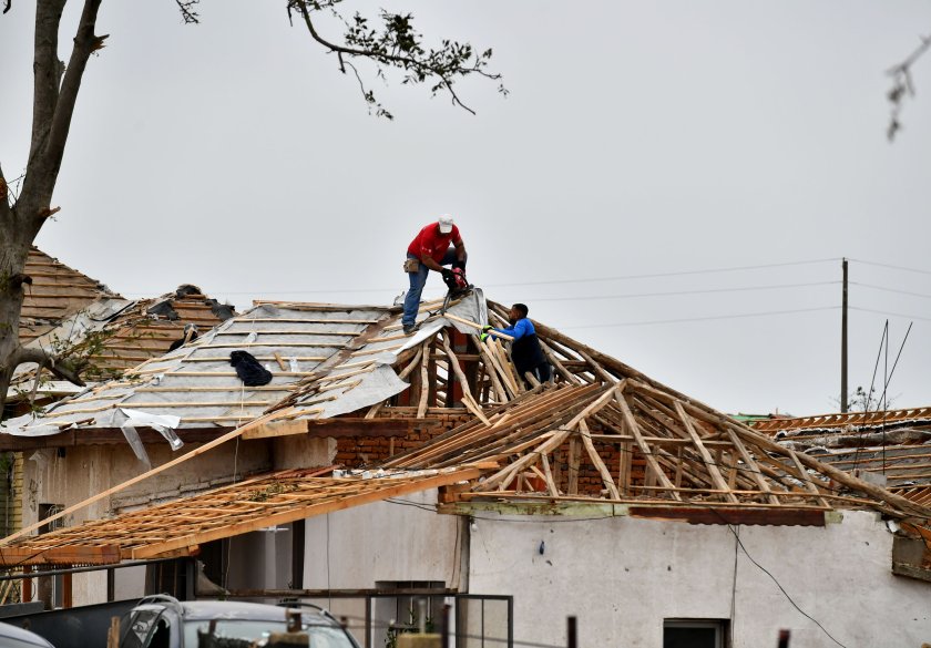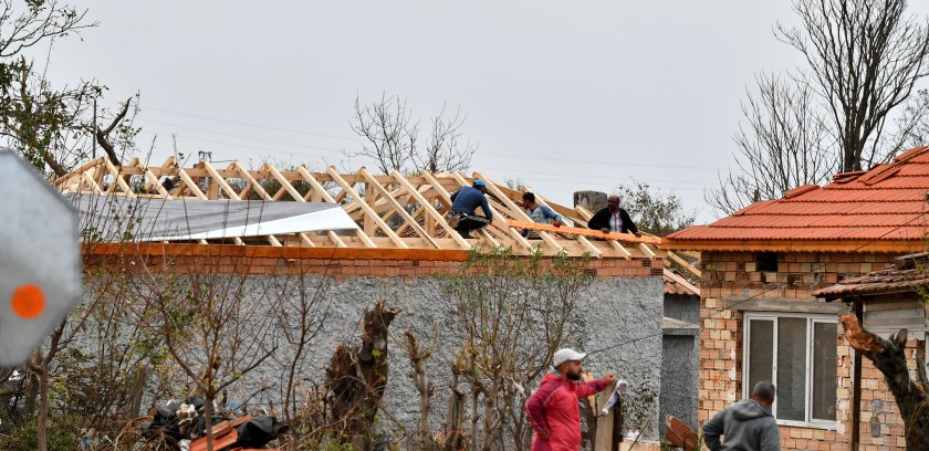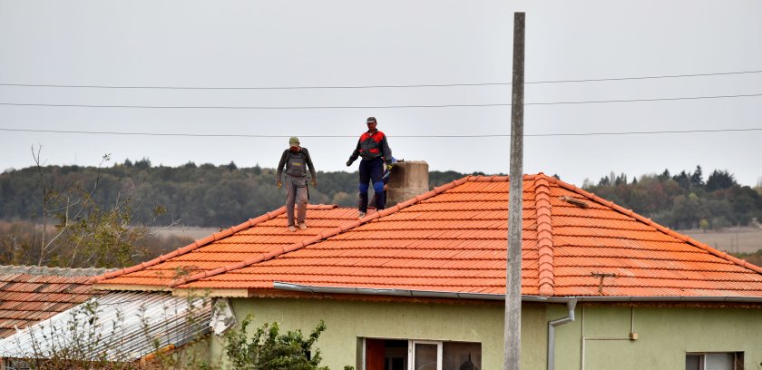 В село Лъвино, Разградска област, не престават на семействата потърпевши от опустошителния ураганен вятър на 4 ноември. Строителни служащи построяват покривните структури на жилищните постройки.