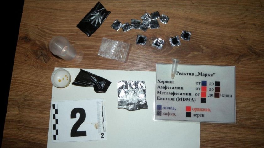 Намерени и конфискувани са 14 грама марихуана, 8 грама метамфетамин, над 6 200 лева, везни и опаковки за размеряване на дози.