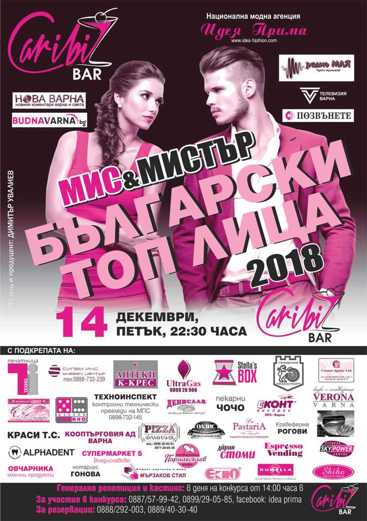 Бар Кариби и Национална фешън организация Идея Прима Ви канят на същинско угощение за сетивата- състезанието за хубост и европейски зрелища- Мис и Мистър Български Топ лица Варна 2018.