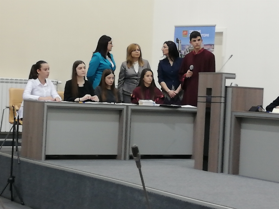 С помощта на прокурорите Надежда Белчева, Кристина Куртева и Ивелина Кьосева за функциите на обвинители, очевидци и вещо се бяха подготвили учениците от комерсиалната гимназия Вангелия Михайлова, Данита Димова, Милена Иванова, Мира Минчева и Петко Тонев.