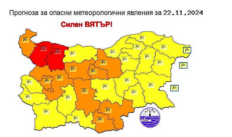 В идващите дни чувството ще е за късна есен и подранила зима. В петък в светлата част на деня внезапно ще нахлува средиземноморски топъл въздух и следобедните температури ще се движат сред 13 и 18 градуса. Ще е изключително прохладно с рисково мощни фьонови пориви, изключително северно от планините. Обявен е червен код за мощен вятър в областите Монтана и Враца.