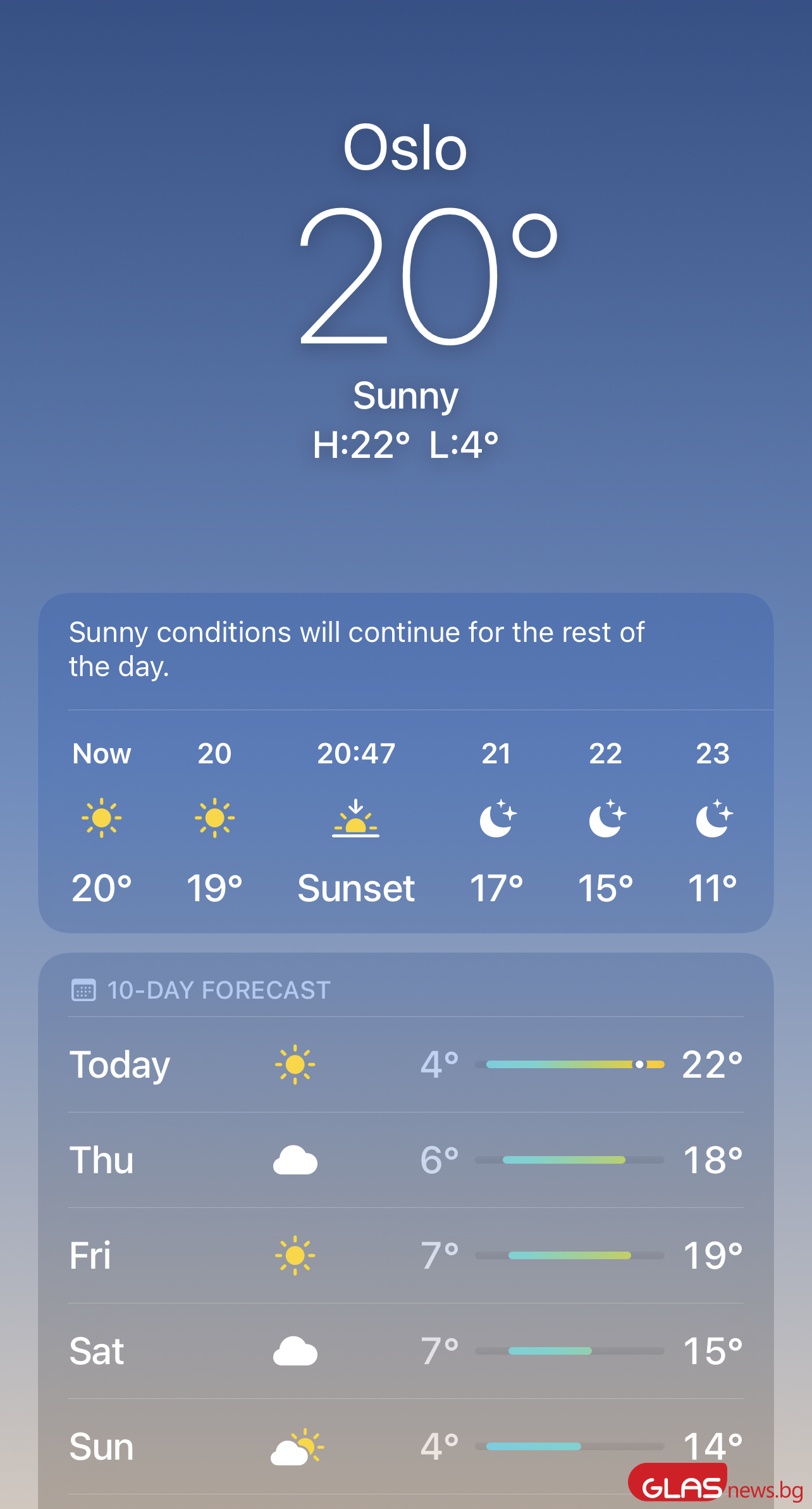 Към 21 часа температура в Осло е 20 градуса, а в София 3, с чувство за минус 2.