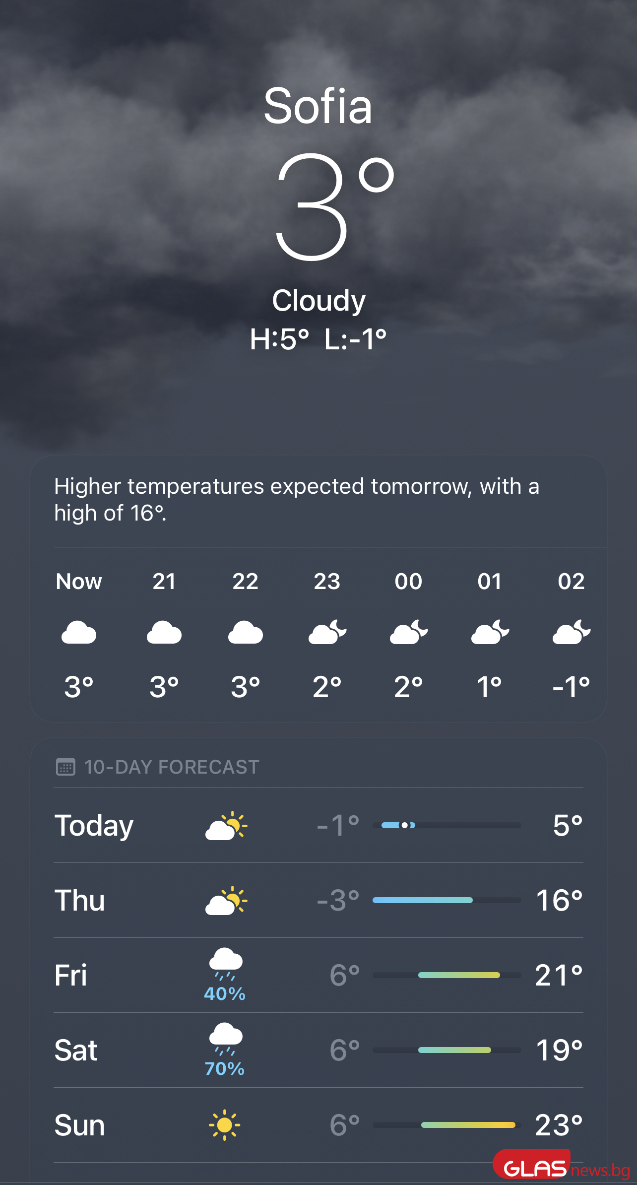Сутринта ще е студено, в западната половина от страната с условия за слани. Минималните температури ще са сред минус 3° и 2°, по-високи по морския бряг, в София към минус 2°.