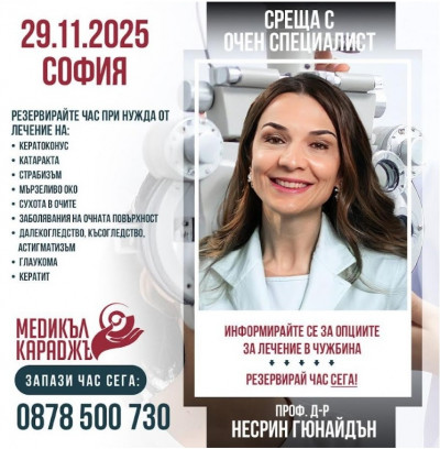 В София ще се проведат безвъзмездни осведомителни срещи с доцент доктор Несрин Туташ Гюнайдън – експерт по очни заболявания от болница „ Мемориал Гьозтепе “ в Истанбул. Срещите ще се проведат на 29 ноември 2025 година (събота) и се провеждат от Здравен информативен център „ Медикъл Караджъ “.