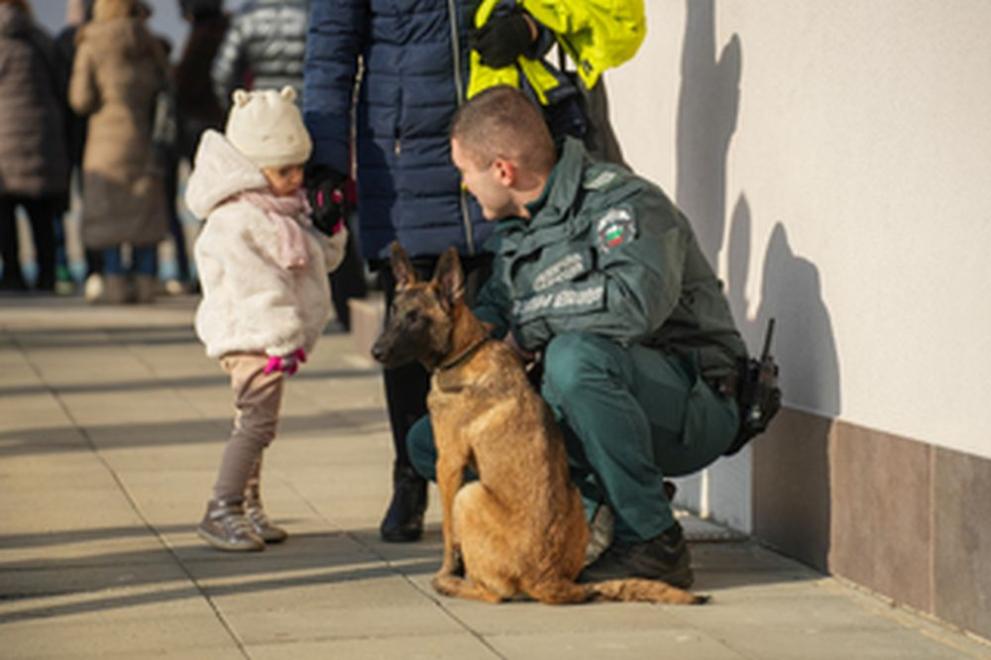 Малчуганите първо се срещнаха със служебните кучета Лери и Цейк, а граничните служители на реда, които са техни водачи, им демонстрираха по какъв начин се прави дресировка за смирение.