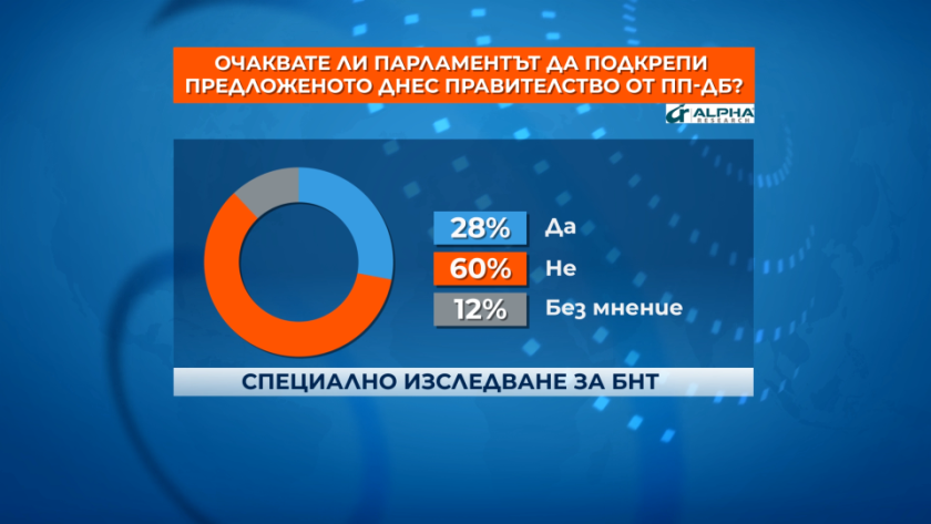 Алфа Рисърч за БНТ: 60% не смятат, че НС ще подкрепи предложения проектокабинет на ПП-ДБ