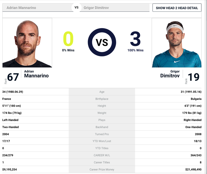 До момента Манарино и Димитров, който е подложен под номер 5 в турнирната скица и стартира непосредствено от втория кръг, са играли три пъти един против различен, като и трите пъти триумфът е бил за българския представител.