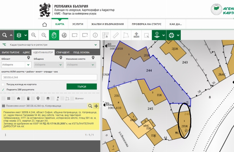 (В тъмносините контури е парцелът на " Интръст " и Делян Пеевски в Копривщица. В елипсата е парцелът на семейство Балови - с кръчма " Ломева къща " )