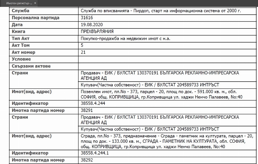 Оказа се, че „ Интръст “ на Делян Пеевски е притежател на прилежащия парцел – Хадживълковата къща (133 кв. м), която е монумент на културата, с двор от 592 кв. м до нея.