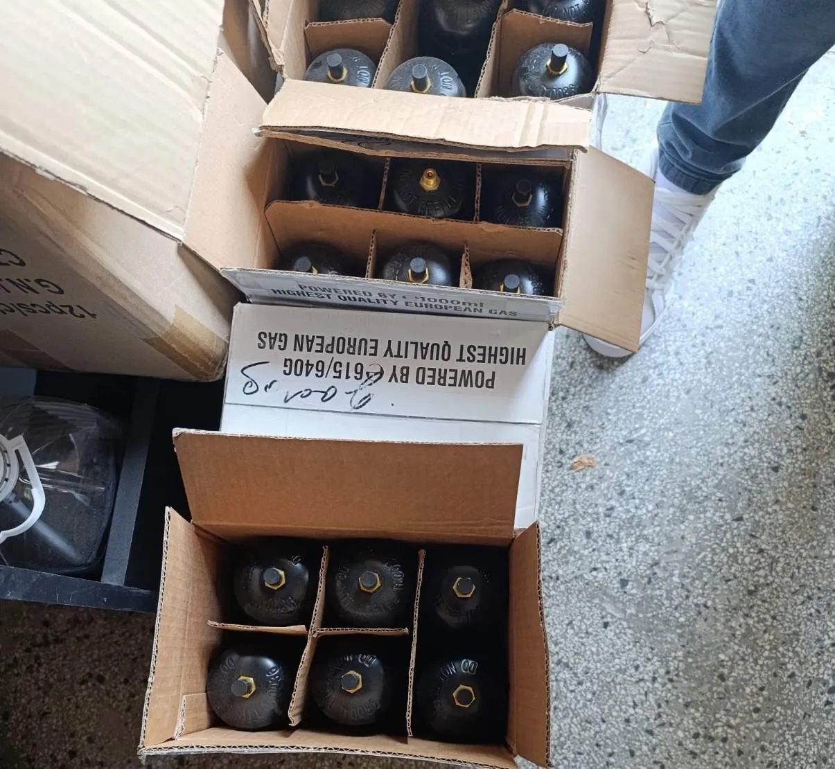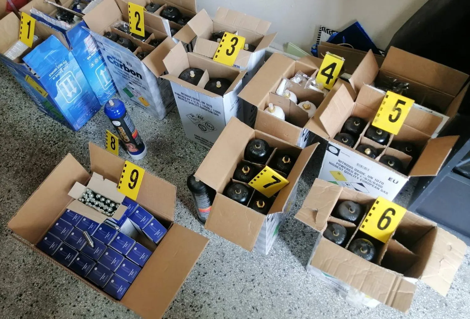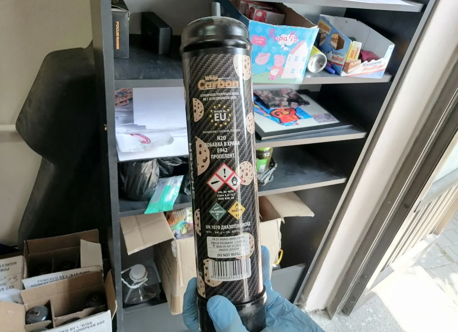 Освен тях са открити и конфискувани 576 флакона, всеки по 8,2 г, с евентуално наличие на божествен газ и 44 машинки- така наречен шприцове за диазотен оксид.