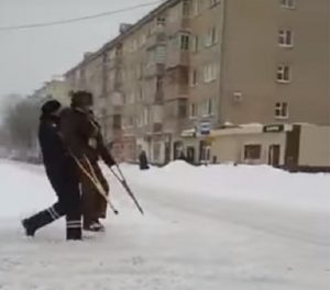 Полицаят Игор Громов попита индивида с какво може да помогне, а по-късно го подвигна на ръце и го придвижи през заледеното шосе.