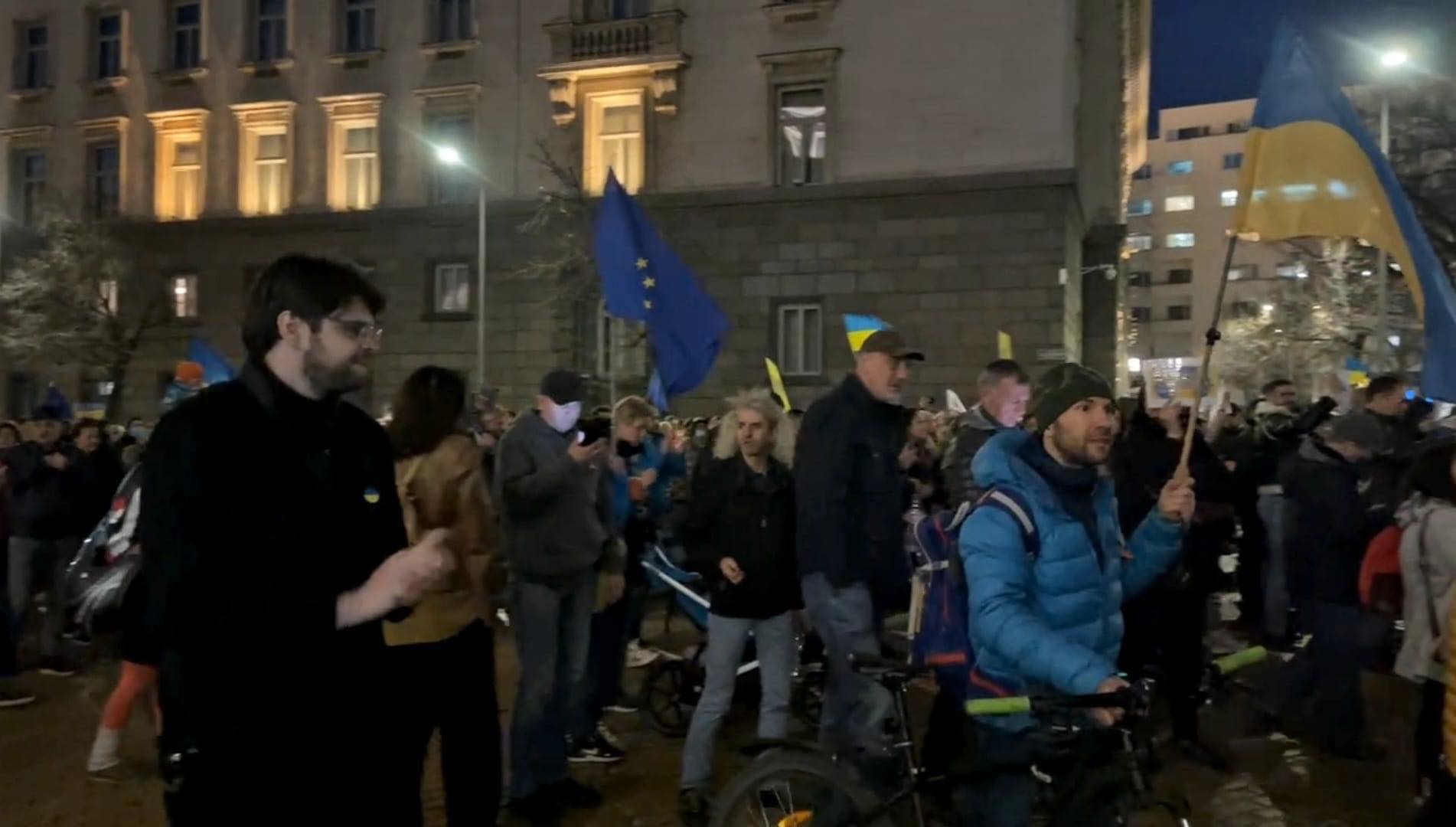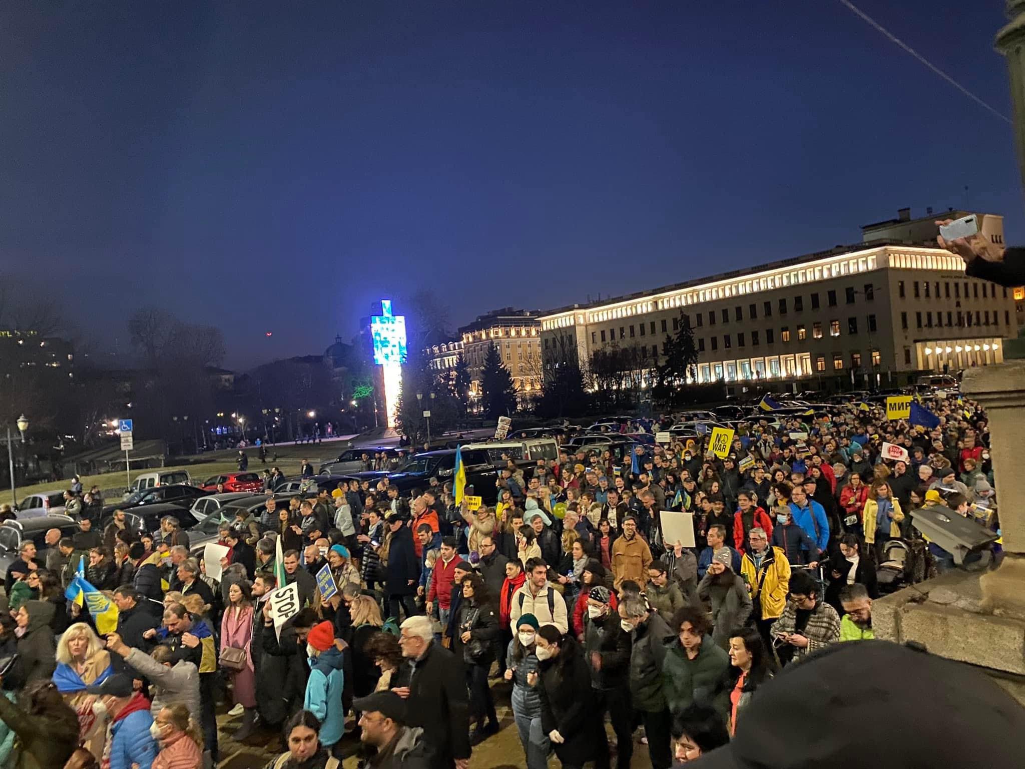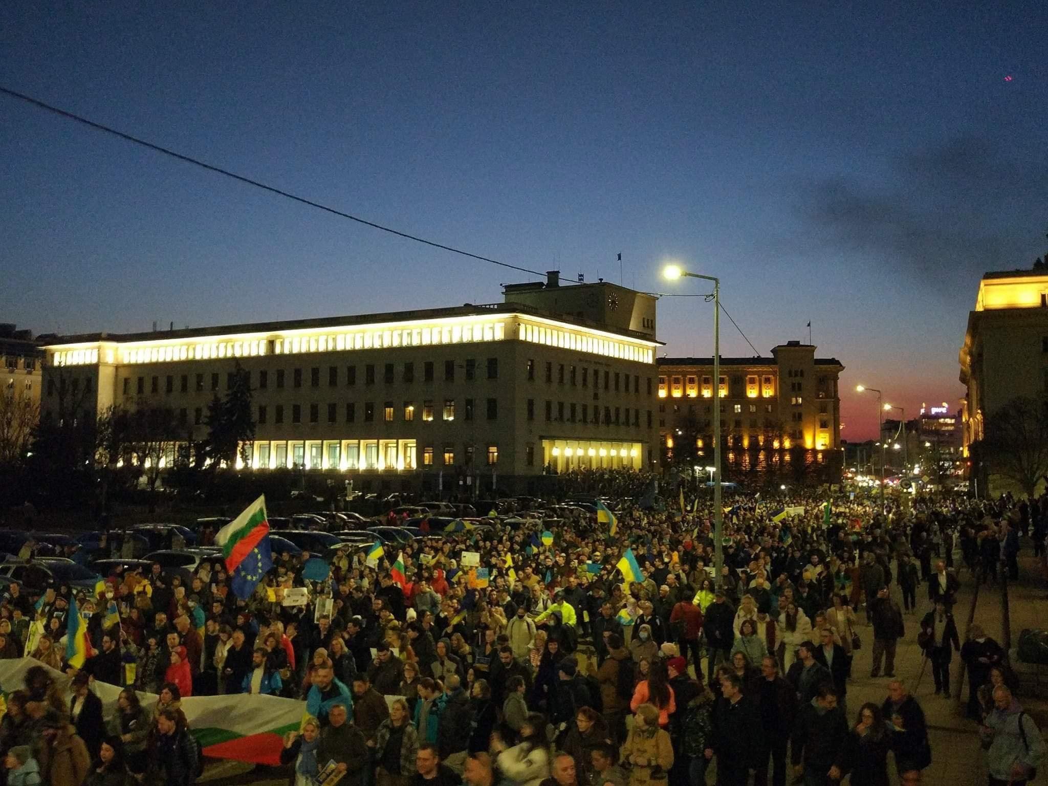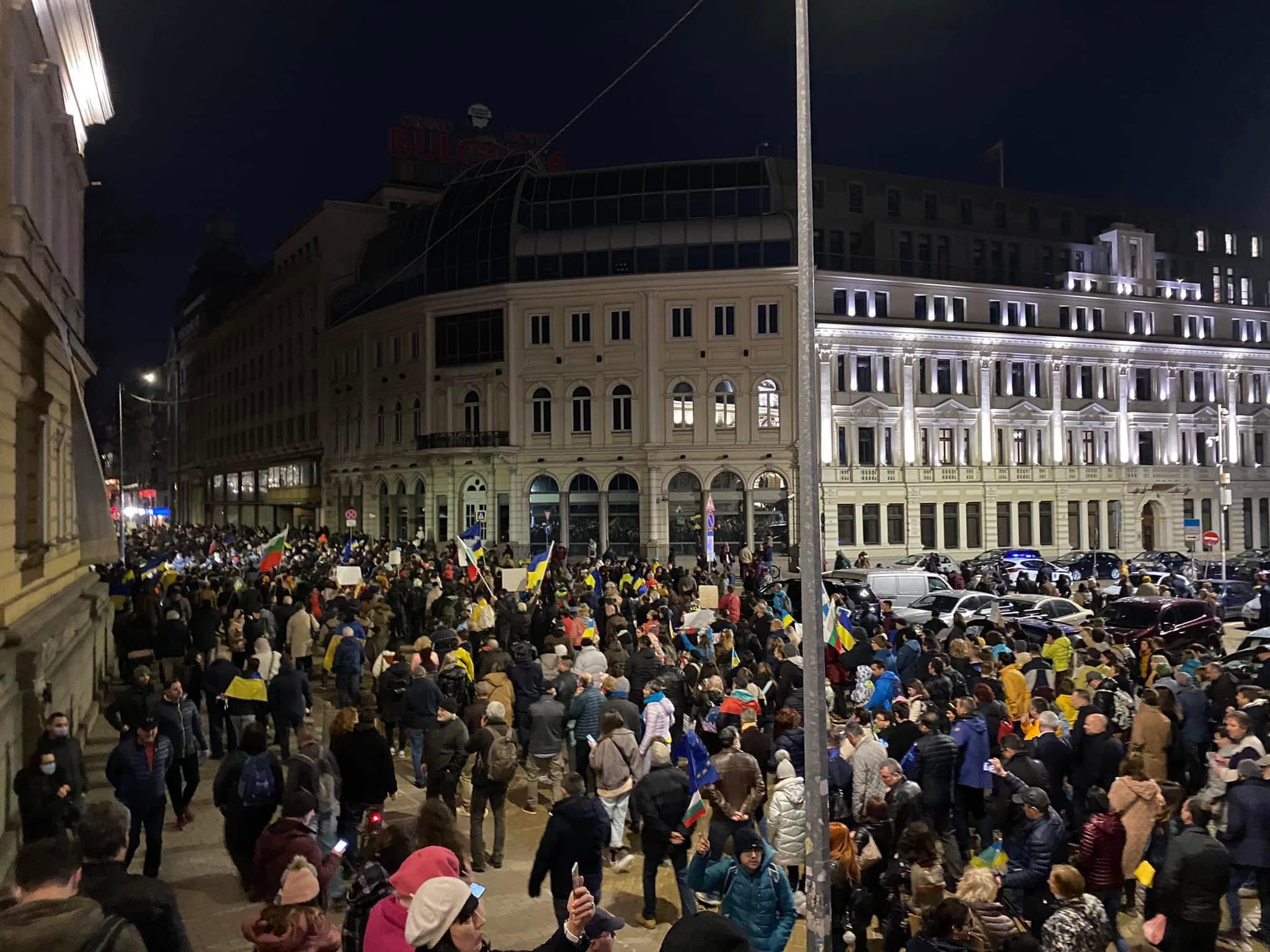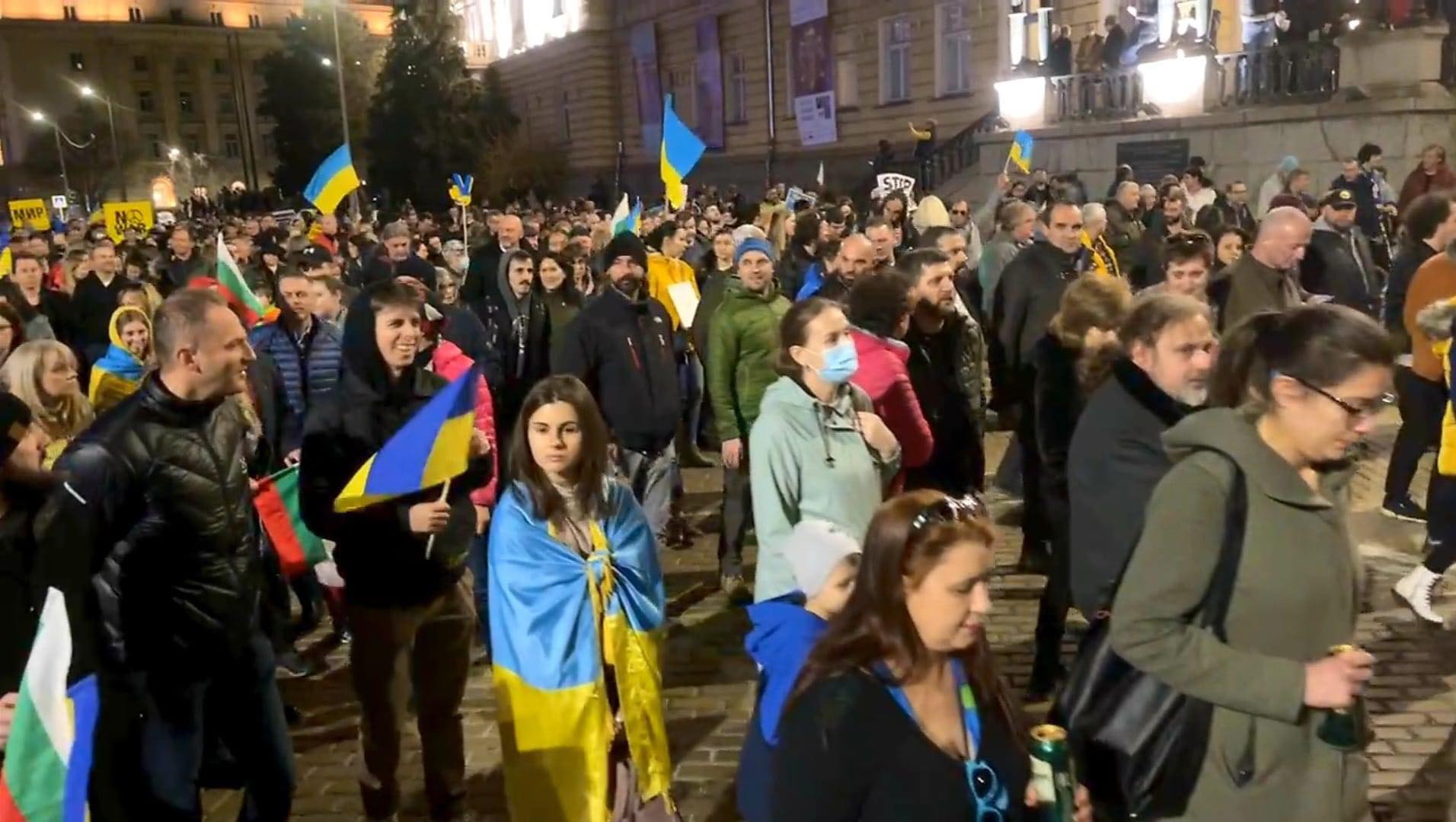 Официално шествието стартира в 18:30 ч. Хората минават през центъра на София, по жълтите павета, до Орлов мост. Много от присъстващите носят украински флагове. Плакат приканва да бъде изправен пред боен арбитражен съд съветският президент Путин.