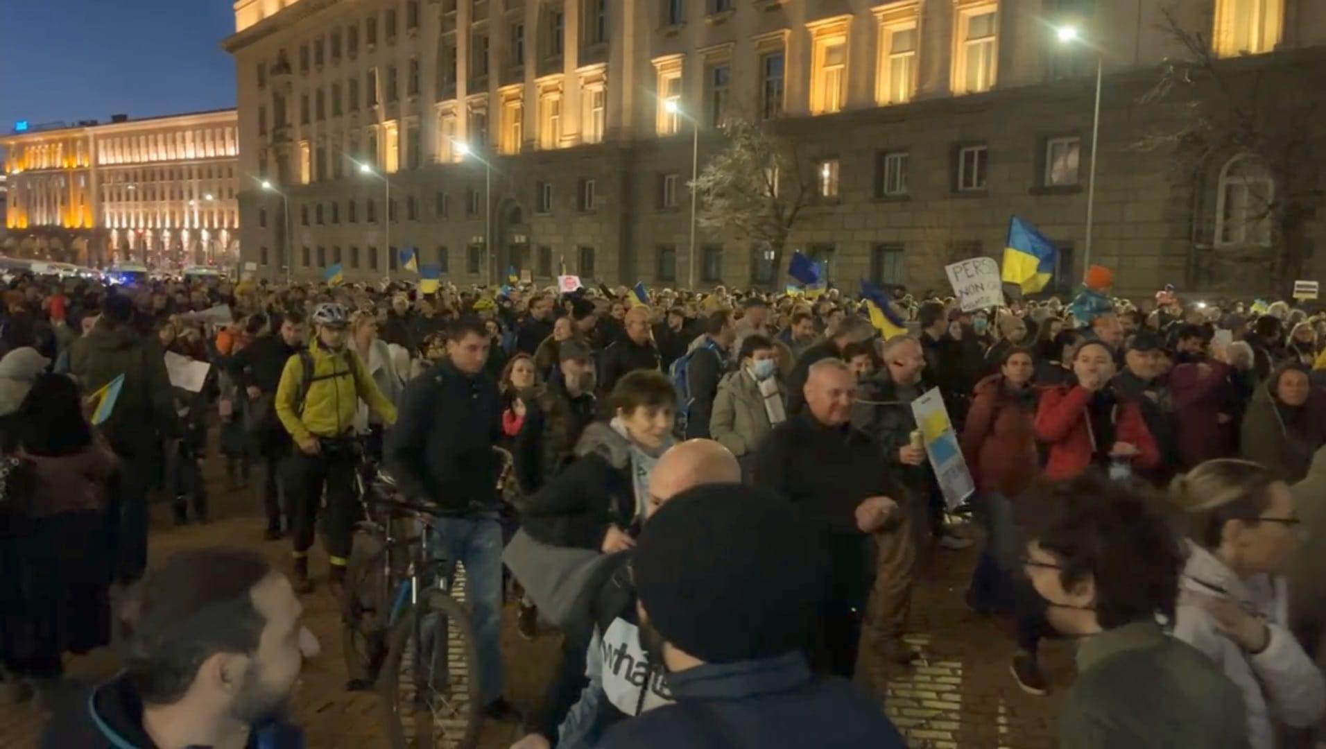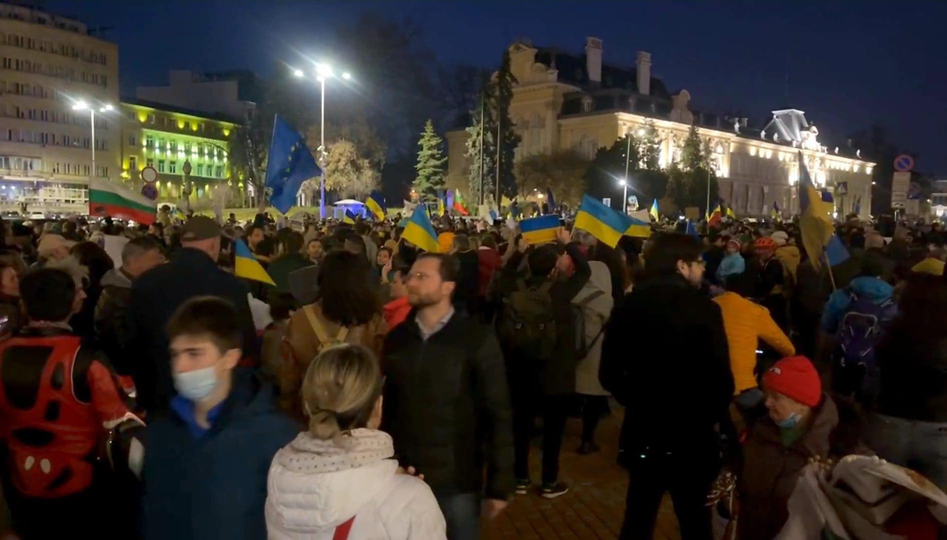 Хората, които са се събрали, поддържат и апела на президента Володимир Зеленски на 24 март демонстрации против войната да има в целия свят.