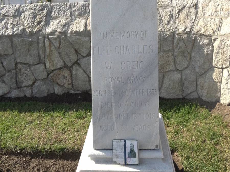 Роден е на 23 декември 1894 година, умрял е на 24-годишна възраст. Съвсем неотдавна ревизия от английската организация, сплотяваща пет сдружения на ветерани, е оставила на паметника ламинирано копие от авиаторското удостоверение на Чарлз Грейг, издадено през 1915 година с номер 2197. От фотографията гледа млад приветлив мъж. Човек може единствено да гадае що за ирационални сили са участници в тази история, дали духът на летеца е разтревожен, дали тя не е някоя преродена здравна сестра, в която той се е влюбил и тази обич по някакъв невероятен метод още оцелява, що за знамение е това. Типично по английски, страховито и призрачно, само че в действителност е напълно същинска история. Последният път, когато е идвала, е било на Задушница, донесла вино, жито, палила свещ, плакала...Казвала, че в действителност намира утешение и като че ли черпи сила от паметника. Указанието било да стои зад него. Както се черпи сила от дърво. И тя го прави. До ден-днешен. Странна илюстрация на войната, която като че ли в никакъв случай не свършва.
