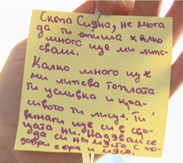 „ Скъпа Сияна, не мога да ти опиша какъв брой доста ще ми липсваш. Колко доста ще ми липсва топлата ти усмивка и красивото ти лице. Ти постоянно ще си в сърцата ни. Надявам се да си на място по-добри хора ”.