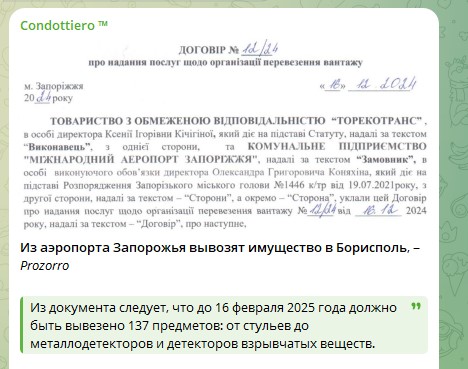 Според украинската държавна електронна система за публични поръчки Prozorro до 16 февруари 2025 година от летище Запорожие до град Бориспол в Киевска област би трябвало да бъдат извозени 137 продукта: от столове до металотърсачи и детектори за експлозиви.