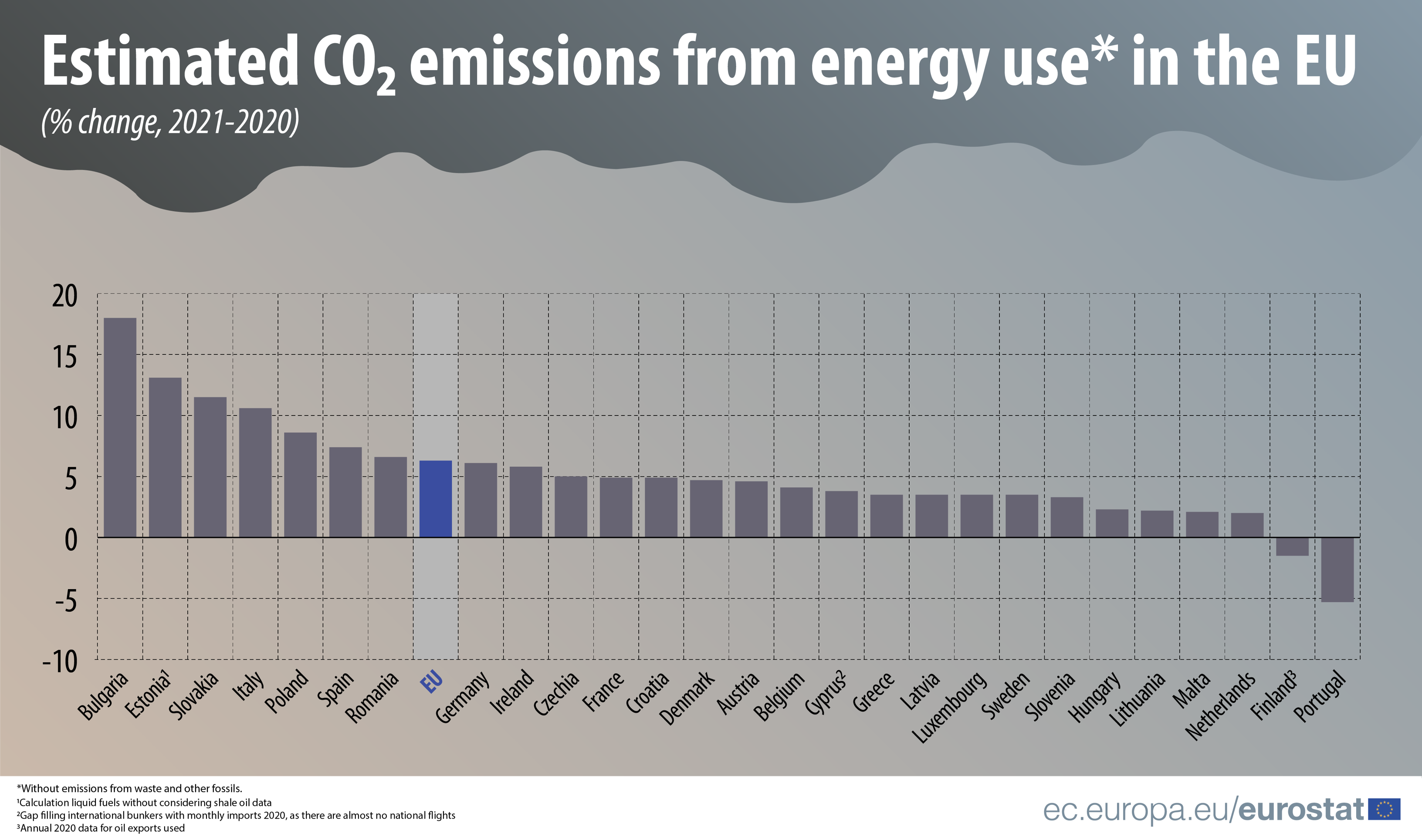 По оценка на Eurostat, въглеродният отпечатък е повишен в съвсем всички страни. Това обаче има своето разумно пояснение. След като през 2020 година светът бе съвсем спрян от рестрикции, наложени поради COVID-19, отчетохме исторически спад в отделянето на CO2. По това време мегаполиси в Китай, Япония, щатите и Европа отчитаха най-чистият си въздух от десетилетия насам.