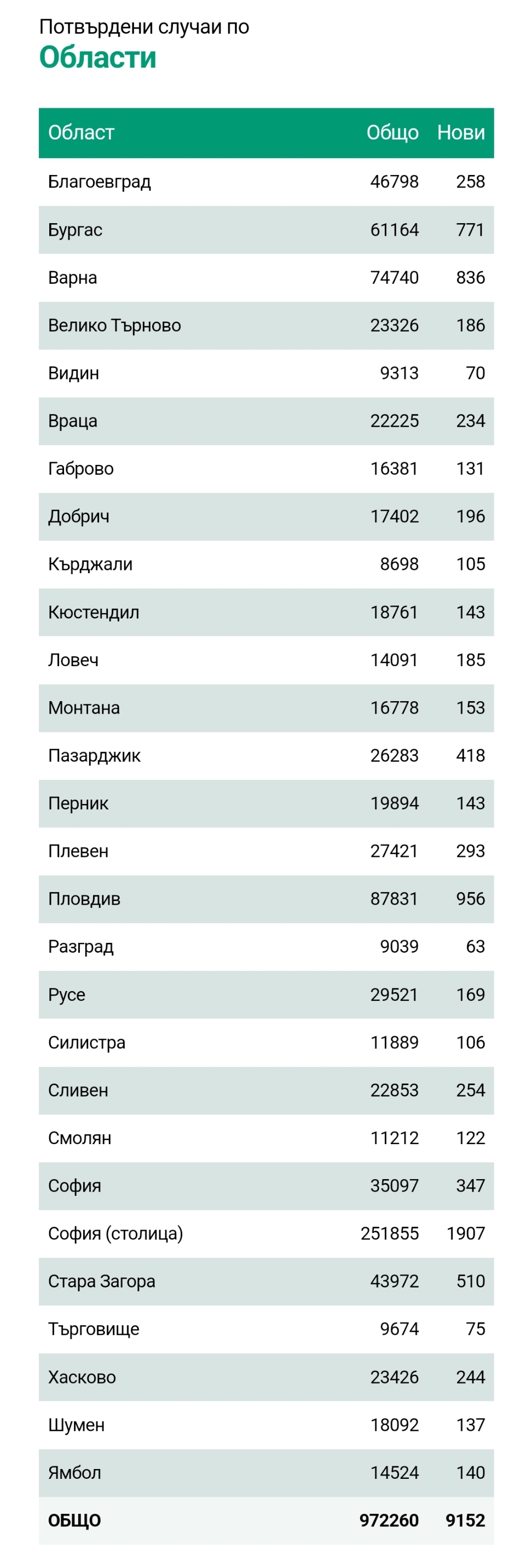 До момента от началото на пандемията инфектиранитеобщо са 972 260 души. Излекуваните са 683 346 - през последните 24 часа те са 4578.