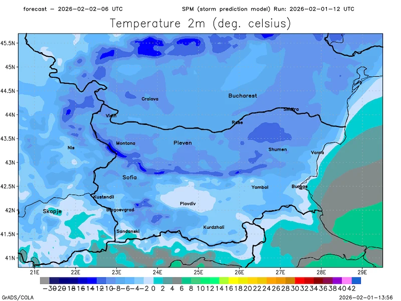 Минималните температури в регионите със снежна завивка ще доближат сред минус 10 и минус 12 градуса, а в планините се чакат стойности до минус 15 градуса. По-топло ще остане времето по Южното Черноморие и в региона на Сандански, където термометрите ще демонстрират сред 2 и 3 градуса над нулата.