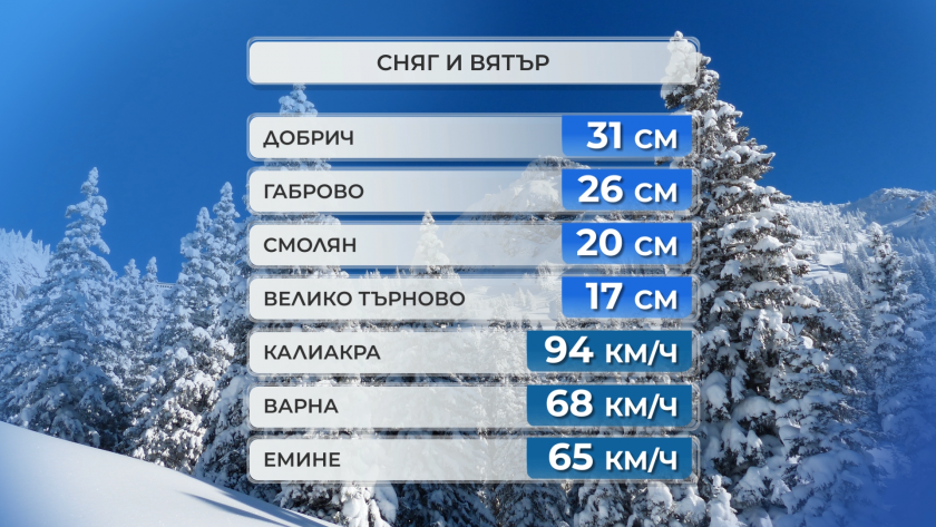 Най-дебела е снежната завивка в Добрич – малко над 30 см. Там, както и по Черноморието и през нощта остана доста прохладно с пориви на североизточният вятър до към 100 км/ч.