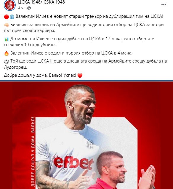 Валентин Илиев е новият старши треньор на дублиращия отбор на ЦСКА 1948, оповестиха " алените " на страницата си във Facebook.