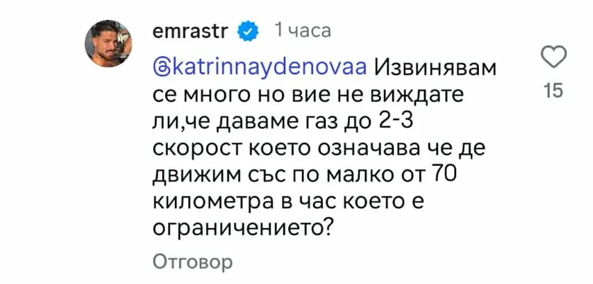 Репликата му обаче провокира нова вълна от разногласия. „ Аз също се оправдавам, само че скоростта ви е над 120-130 км/ч. И за какво, откакто казваш, че караш с ограничаването, километражът ти е замазан? Вие сте публични персони и това е неприятен образец! “, отвърна потребителят kostov1914.