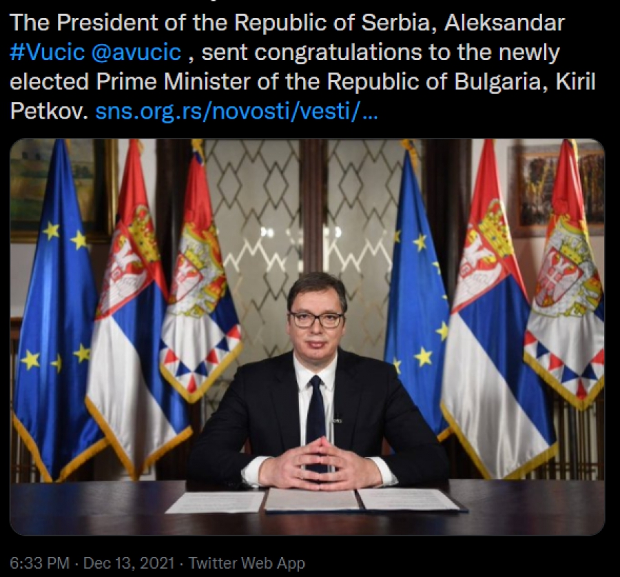 Сръбският президент Александър Вучич е изпратил приветствен адрес до новоизбрания министър председател Кирил Петков. Новото държавно управление - кое дефинира ще го бъде ли?