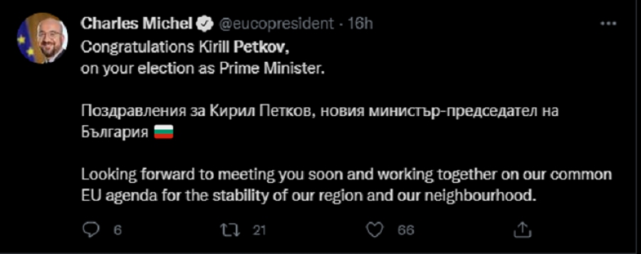 Председателят на Европейския съвет Шарл Мишел също насочи своите поздравления към новоизбрания министър председател на България. Отново в Twitter той написа, че чака дружно да работят за общия европейски дневен ред и за стабилността на района.