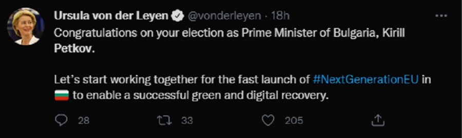 Председателят на Европейската комисия Урсула фон дер Лайен за нов министър-председател на България. „ Поздравления за избирането Ви за министър-председател на България, Кирил Петков “, написа тя. Кабинетът " Петков " незабавно се заема с цената на тока