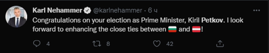 Новият австрийски канцлер Карл Нехамер , който е и предпоследният, встъпил в служба преди Кирил Петков (бел.ред. - последният е Олаф Шолц), също изрази вяра, че връзките сред Австрия и България ще се задълбочат.