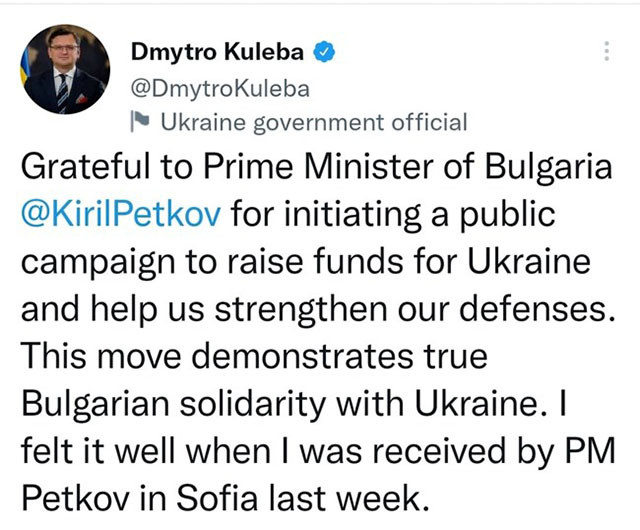Външният министър на Украйна Дмитро Кулеба благодари на Кирил Петков за инициираната от българския министър председател през днешния ден акция за набиране на средства за муниции за Украйна. Министър-председателят разгласи в обява в персоналния си профил във Facebook, че дава начало на обществена акция за набиране на финансов запас, който да бъде възложен на украинското държавно управление.