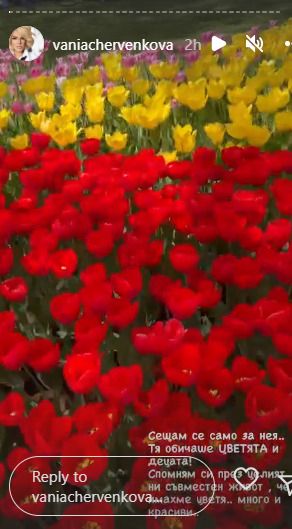 Преди седмици Ваня загуби индивида, на който дължи всичко, а точно майка си, написа woman.bg. И въпреки да споделят, че времето лекува, в действителност тази болежка като че ли става все по-силна. Така наподобява и от последните изявления на бизнесдамата в обществените мрежи. Преди часове тя показа няколко сторита с красиви цветни градини от лалета. И разкри, че приказната панорама ѝ е напомнила за майка ѝ, която е обичала цветята. Ето какво написа Червенкова, спомняйки си за хубавите отминали години: