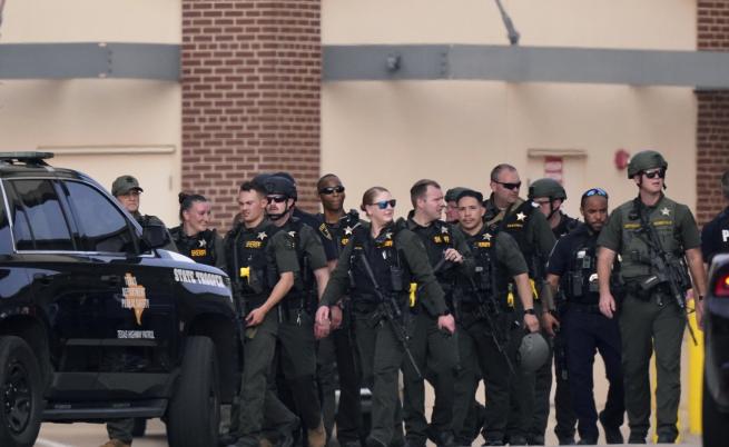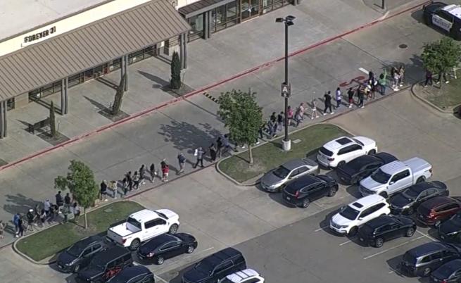 На заглавната фотография: Хора с излизат с вдигнати ръце от комерсиалния център в Тексас.