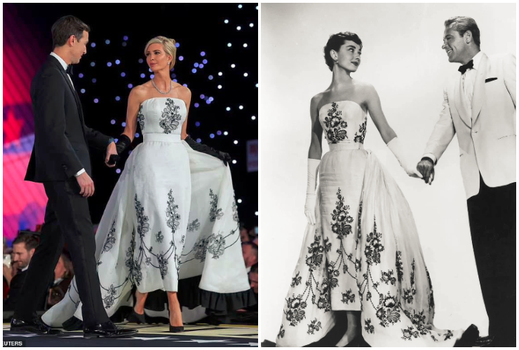 Другата бе впечатляваща рокля в бяло и черно с голи плещи, с която бе облечена за бала вечерта. И двата тоалета обаче, бяха въодушевени от други сходни стайлинги.Бялата рокля с черни бродерии на цветя е особено основана за случая от марката Givenchy. Модният дизайн е не просто въодушевен, а имитация на иконичен тоалет, носен от Одри Хепбърн през 1954 година във кино лентата „ Sabrina “, зад който стои гения на Hubert de Givenchy.