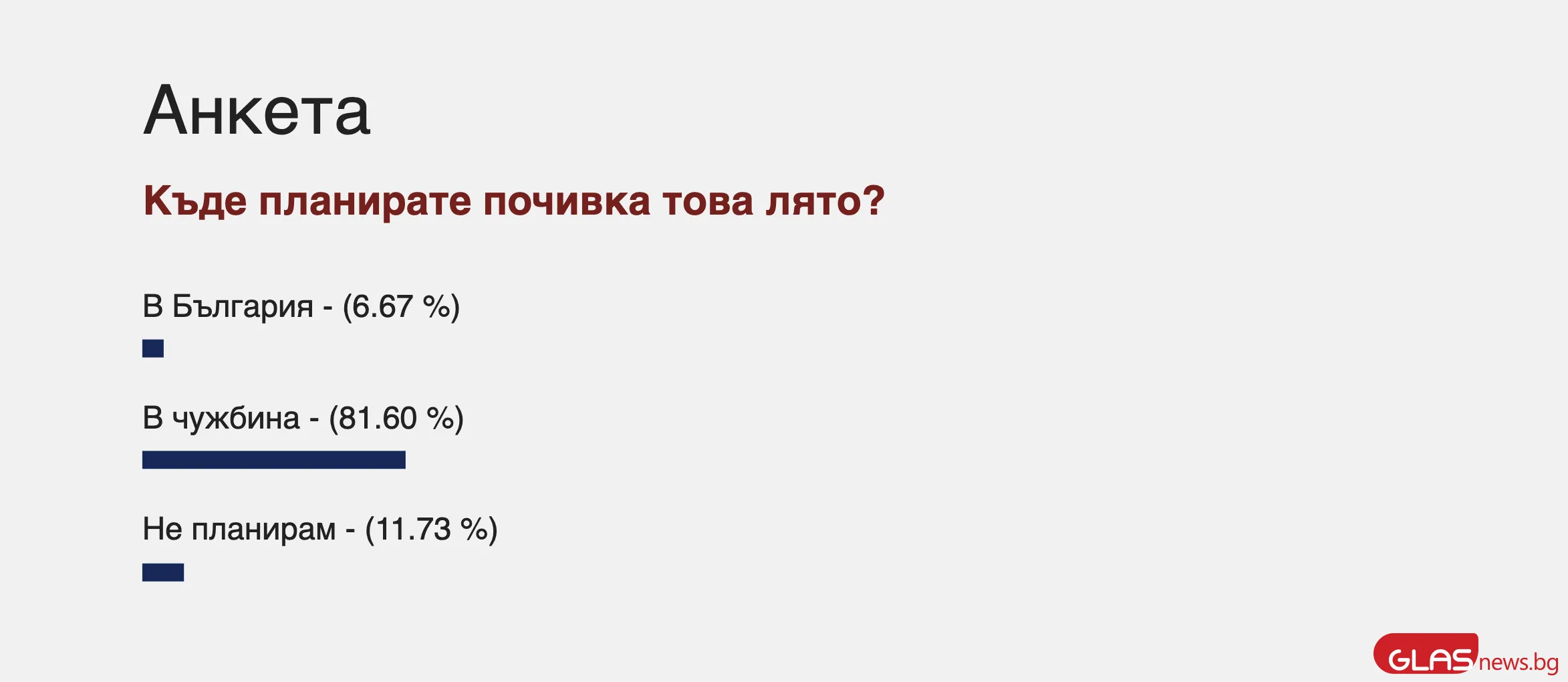 Идеята на Министерството на туризма е добра, само че дали ще успее да притегли български туристи? В анкета, която публикувахме на 19 юни, попитахме вас, читателите на GlasNews, къде смятате да почивате това лято. В анкетата се включиха 5200 души, а вероятните отговори бяха три: " В България ", " В чужбина " и третия - " Не възнамерявам ".