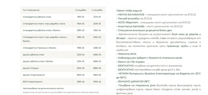Проверихме какви са офертите за празненството и остана изумен от цените. Кувертите за 3 нощувки варират сред 1815 лв. или 605 лева на нощ, което е най-евтината алтернатива. Най-скъпият вид е 3180 лева, или малко над 1000 лв. за вечер, като това е пакет единствено за един човек. За тази цена умерено можеш да празнуваш и почиваш 7 дни в Тайланд, написа в. " Уикенд ".