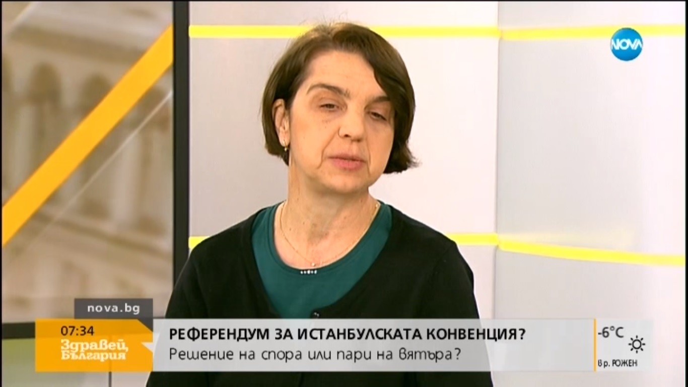 Въпросът за референдума при нас стои малко по-различно. За нас въпросът е дали парите, които ще отидат за референдум, не могат да бъдат употребявани за нещо по-рентабилно. Това съобщи в " Здравей, България " психологът Катя Кръстева на въпрос дали би трябвало да се приведе референдум " за " или " срещу " утвърждението на Истанбулската спогодба.