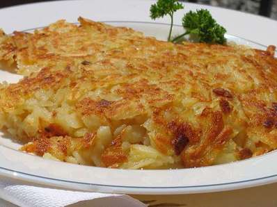 Приготвяне: Обелените картофи сварете до полуготовност, настържете едро и ги сложете на компактен пласт в на-мазнен тиган. Похлупете. След 10 минути намажете от вътрешната страна стената на тигана с бучка масло, с цел да се стече към дъното. Гответе под похлупак още 10 мин. и повторете мазането с масло. Похлупете и обърнете тигана, с цел да прехвърлите рьощите върху капака. С разклащане на капака ги върнете назад с неопържената страна надолу, както се обръща омлет. Пържете до апетитна коричка изпод, като на два пъти прибавете по 1 бучка масло.