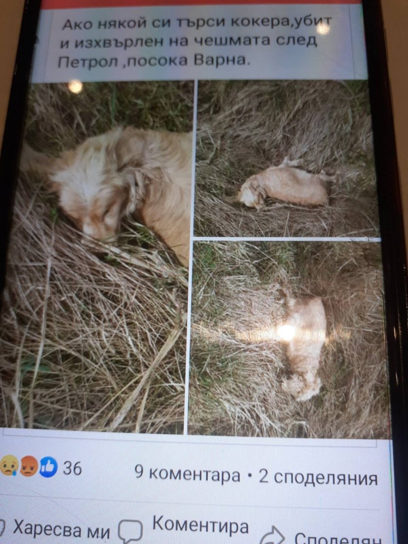 Варненка откри натрупа на кокер шпаньола си. Жената оставила болното животно за приспиване и кремация, а седмица по-късно попада на фотоси на тялото на клетото куче, научи Lupa.bg. Друга гражданка попаднала на захвърления мъртвец на кучето и качила фотосите в обществената мрежа, надявайки се някой да разпознае четриногото. Ужасяващите фрагменти достигнали и до собственичката на кокера - Славена Иванова, която била потресена от гледката и кощунството.