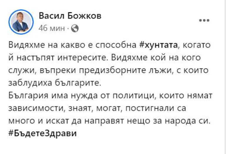 „ България има потребност от политици, които нямат зависимости, знаят, могат, постигнали са доста и желаят да създадат нещо за народа си “, добави в своя пост Божков.