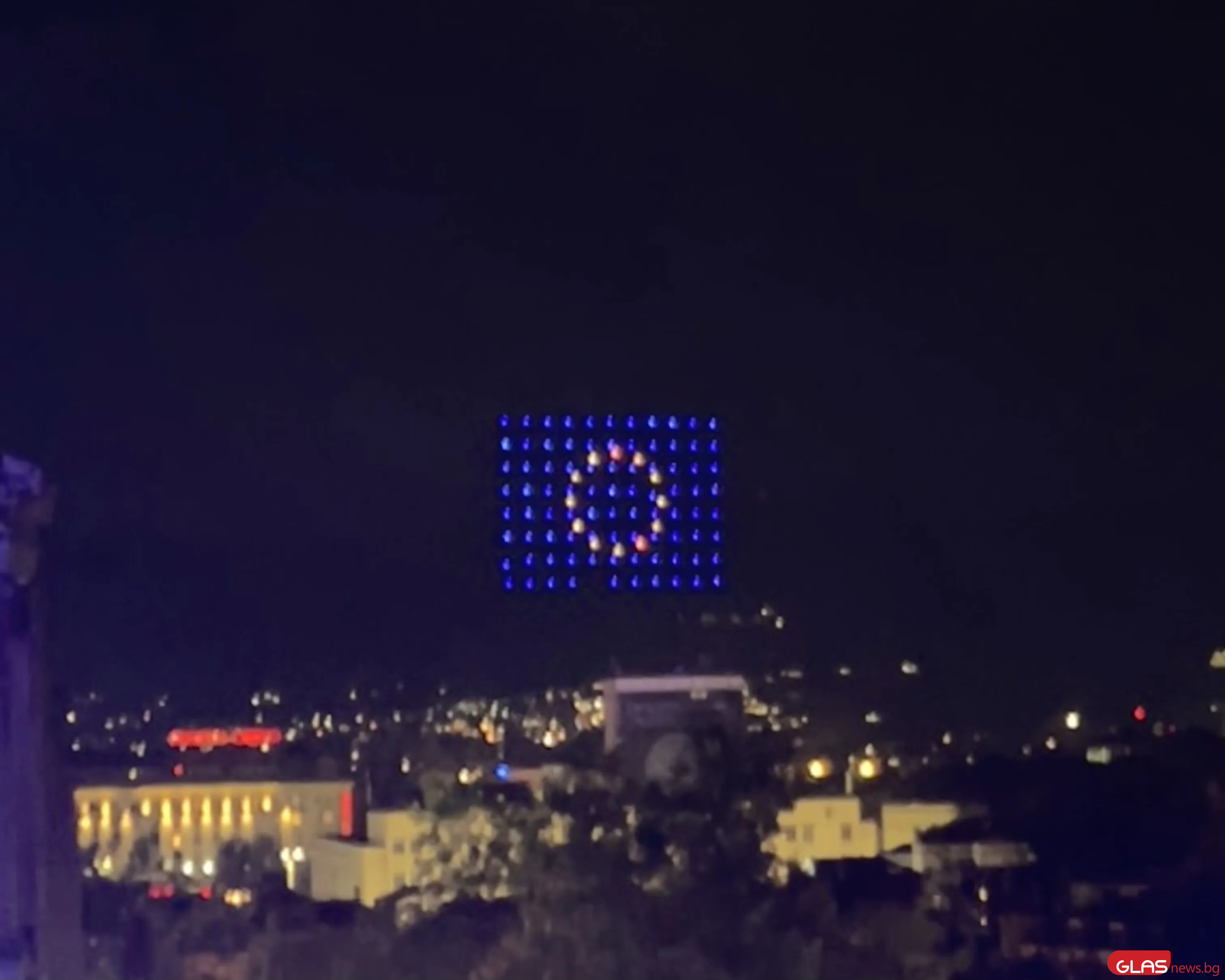 Дроновете бяха 100 и образуваха разнообразни фигурки. Първо те се разпръснаха като фойерверки преди да се наредят и светнат в цветовете на националния ни байрак. Непосредствено по-късно пристигна ред и на Европейското знаме.