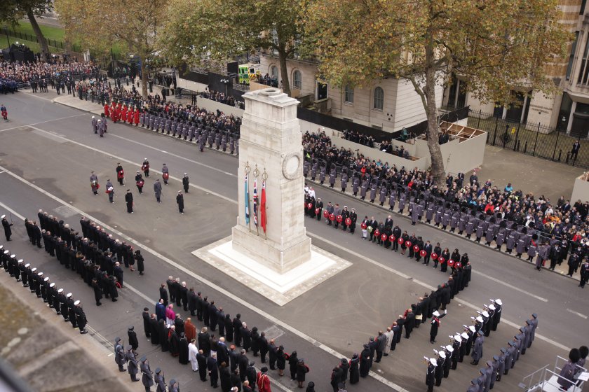 Крал Чарлз Трети, престолонаследникът Уилям и министър председателят Стармър поставиха венци на мемориала на починалите военнослужещи в центъра на Лондон.