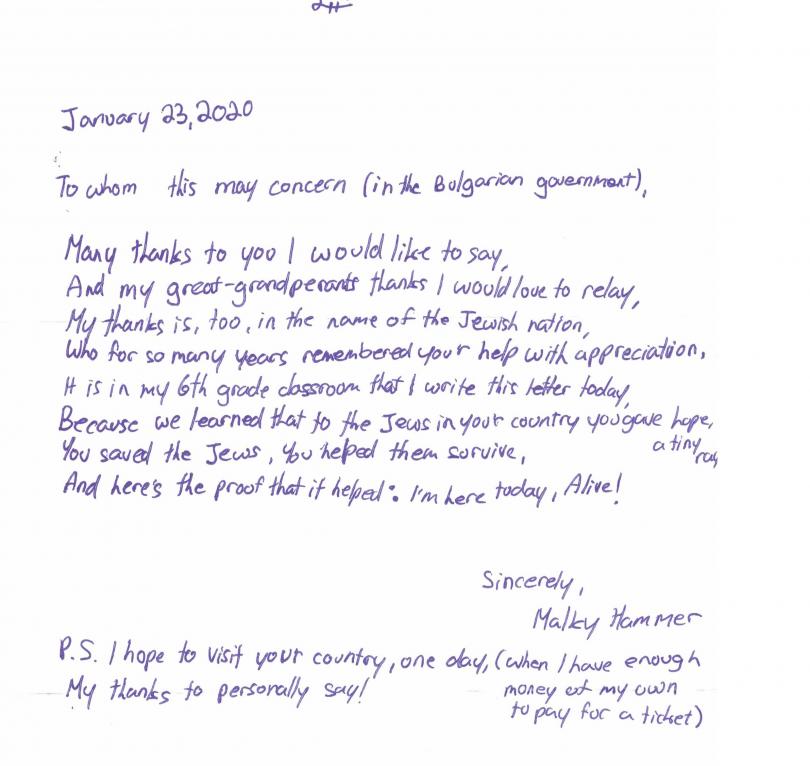 Бих желала да ви кажа „ Много благодаря “ и с голямо предпочитание бих желала да предам и благодарностите на моите прабаби и прадядовци. Моите благодарности са също и от името на еврейската нация, която толкоз дълги години помни с благодарност вашата помощ. Аз съм ученичка в 6 клас и през днешния ден пиша това писмо от класна си стая, тъй като научихме, че вие сте дали лъч вяра на евреите във вашата страна, избавили сте ги и сте им помогнали да оцелеят. Ето го и доказателството, че в действителност сте помогнали: Аз съм тук през днешния ден, жива!