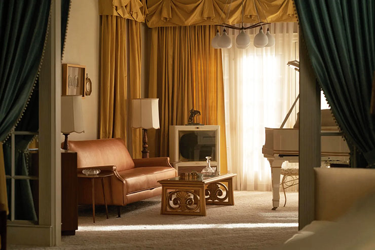 Оказва се, че Деверел в никакъв случай не е посещавала Грейсленд. За да построи впечатляващо достоверния интериор, дизайнерката се впуска в натоварен проучвателен развой, търсейки особено да улови по какъв начин наподобява имението, когато Присила дойде в него през 1963 година, и по какъв начин то се трансформира през времето, когато живее там, до момента в който не го напусне десетилетие по-късно.„ Придържахме се към публично известните изображения на Присила, идваща в Грейсленд “, споделя Деверел пред списание Vogue. „ Искахме да забележим нейната позиция, а да не се фокусираме върху Елвис. Това е бил фамилният им дом и ние искахме да отразим по какъв начин тя се е чувствала там “, прибавя дизайнерката.