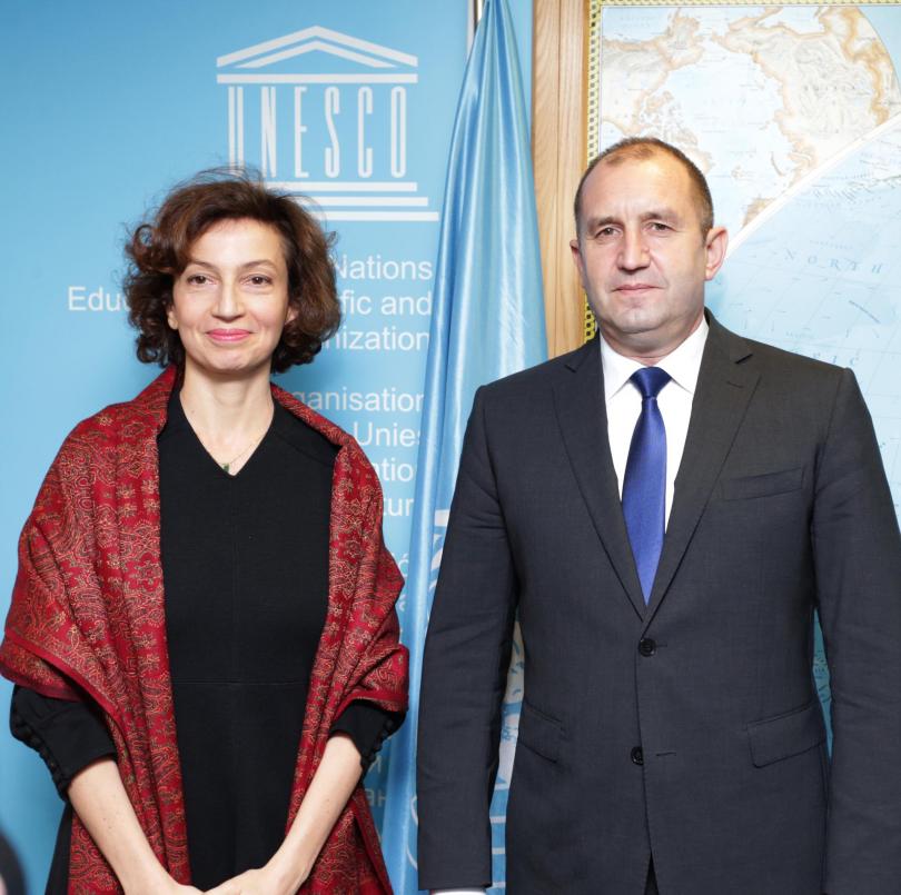 Във втория ден от визитата си в Париж президентът Румен Радев се срещна с генералния шеф на ЮНЕСКО Одре Азуле. Двамата са коментирали опциите за опазването и развиването на историческото завещание. България може да разчита на помощ от ЮНЕСКО за нови археологически разкопки.