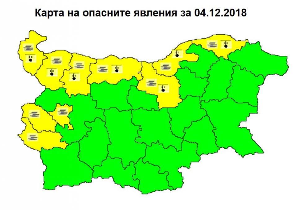 Жълт код поради мъгли и ниски температури е разгласен в общо 10 области. Според прогнозите на синоптиците в областите Видин, Монтана, Враца, Плевен, Велико Търново, Русе и Силистра времето ще се задържи мъгливо и дневните температури ще останат негативни.