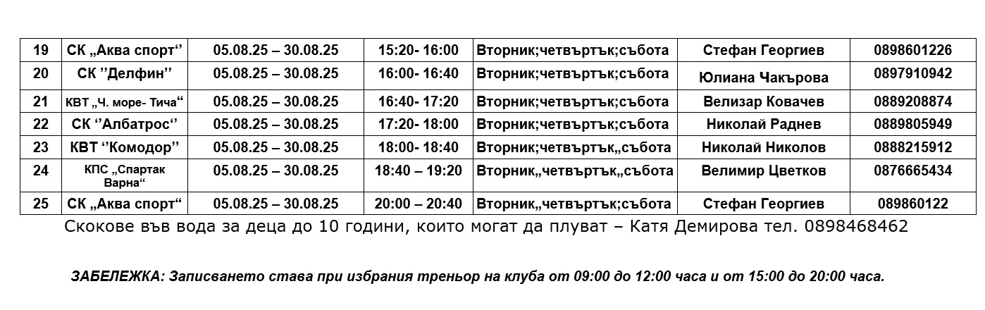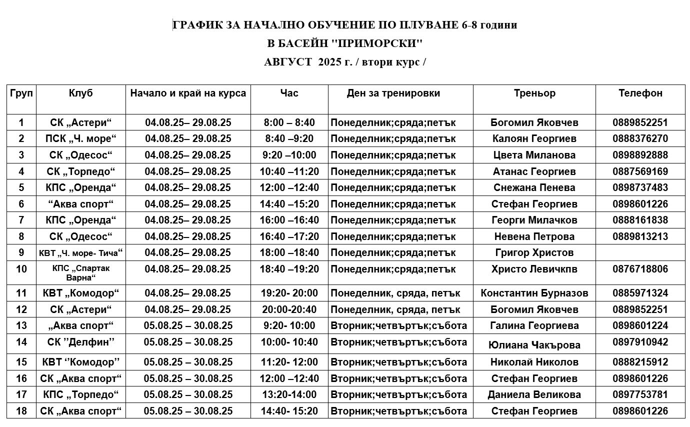 Началната дата на втория курс на образованието също се трансформира - ще започва от 4 август и ще продължи до 30 август 2025 година в това число. По разгласен график на часовете и клубовете родителите избират клуб и час за образование. Записването става с телефонно позвъняване до определения треньор, представител на плувен клуб, участващ в общинската стратегия.