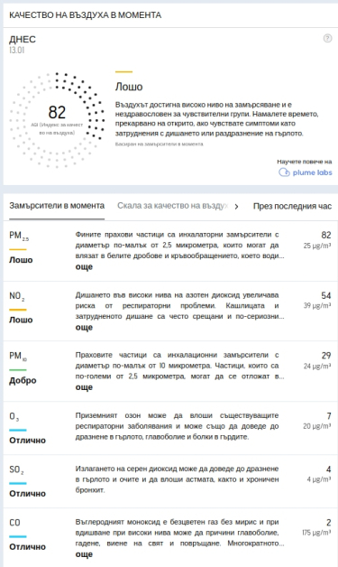 Ако питаме системата AccuWeather обаче, към този част качеството на въздуха в Пловдив е неприятно по индикатори ФПЧ и азкотен диоксид. По техни данни в следобедните часове на 13 януари се регистрират над 80 µg на пространствен метър за фини прахови частици и 54 µg/m³ азотен диоксид.