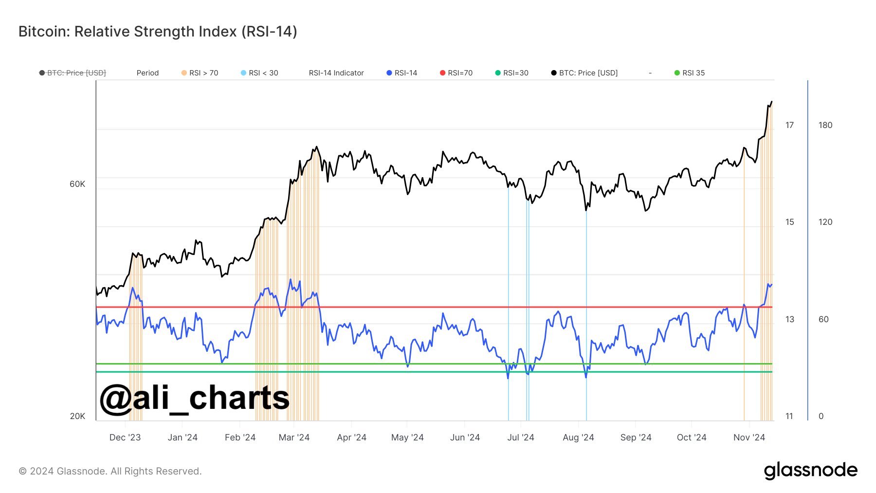 С показател на относителната мощ, надхвърлящ 70, BTC се намира на свръхпокупна територия, което постоянно предшества отдръпването на цените.
